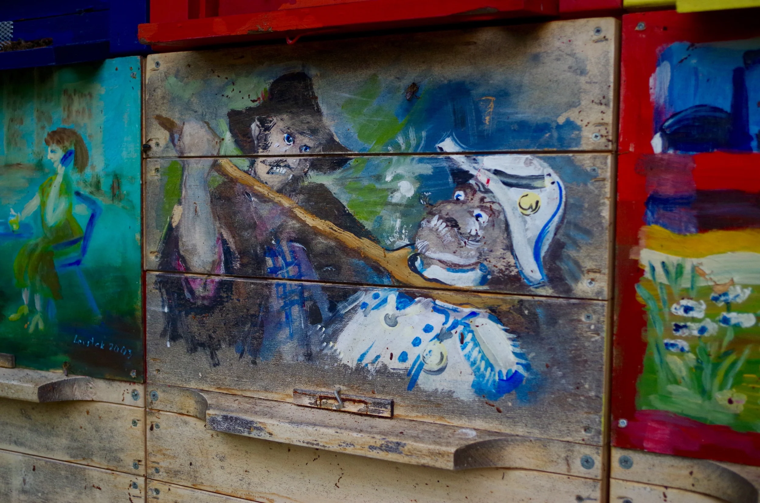 Traditionally Slovenian beehives are adorned with painted panels, depicting religious or cartoonish scenes, such as two men fighting over a cow while a lawyer takes the milk, or women dragging their husbands from the pub. Danijela Blaž at Kralov Med runs panel-painting workshops, and there is even a Museum of Apiculture in the beautiful town of Radovljica, a 30-minute drive northwest of Ljubljana. The museum displays 600 original hive panels, and visitors can learn about the history of Slovenia’s rich tradition of beekeeping, as well as see some of the tools used in early apiaries.